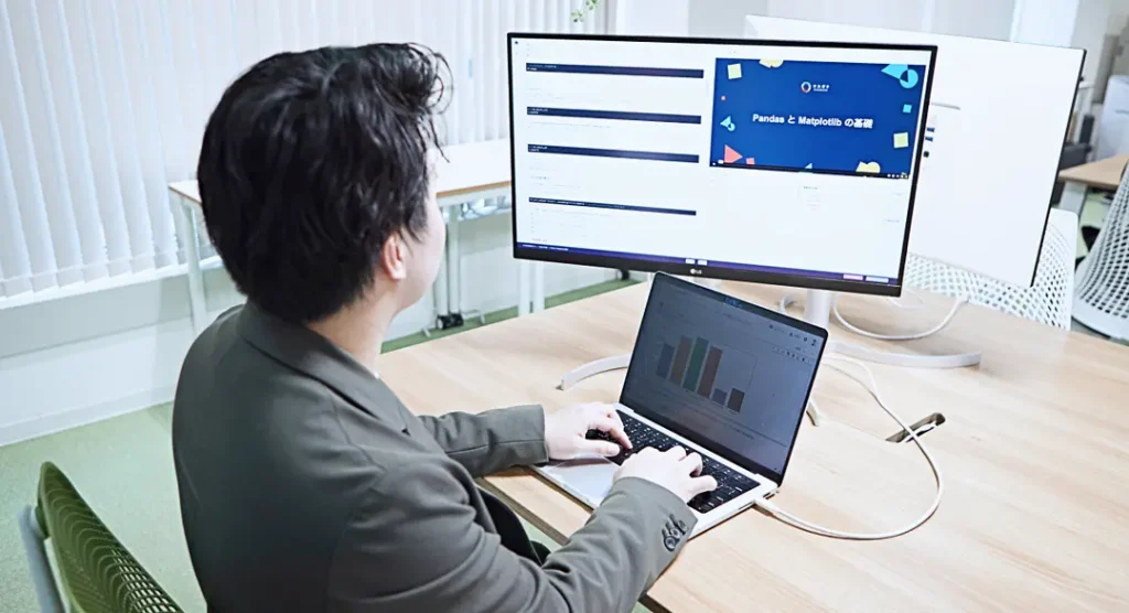 本コースでは、Python基礎、データサイエンス、機械学習、ディープラーニングの入門から実践まで網羅され、最終的には機械学習API構築やWebアプリ開発も行います。