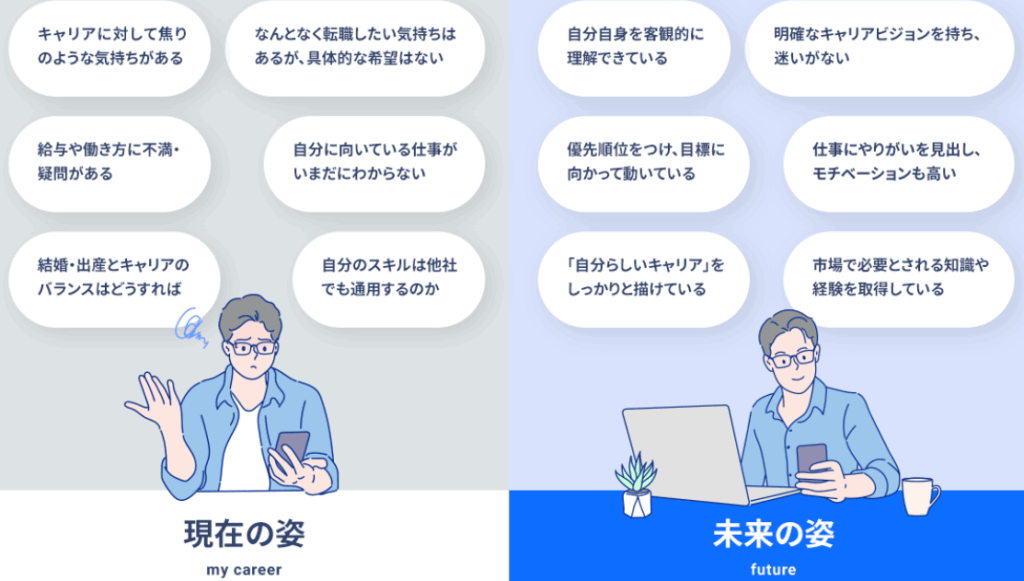 口コミを見ると「モヤモヤしていたキャリアの方向性が明確になった」「転職に踏み出す自信がついた」といった声が多数。